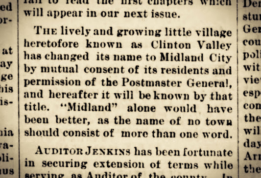 Originally named "Clinton Valley" in honor of the county it is located in. In 1886 ithe town was renamed to "Midland City". Eventually the name was shortened to just Midland.