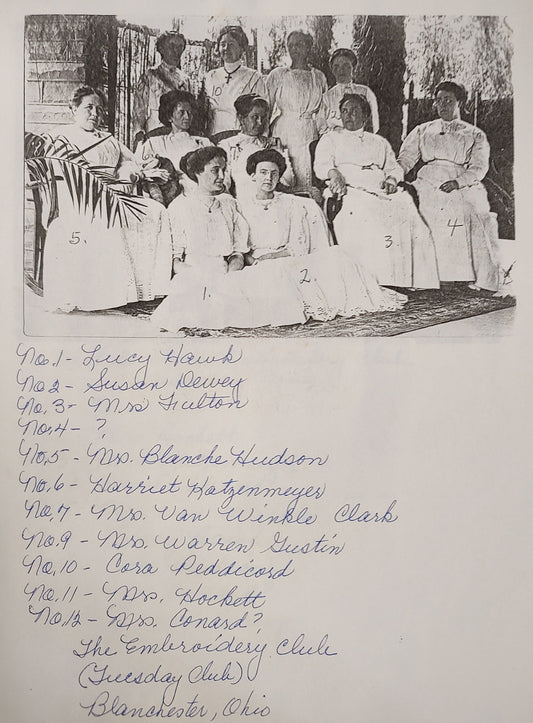 The club met on the 1st and 3rd Tuesdays of the month. Meetings started at 2:00 p.m. and anyone late was fined 5¢ for tardiness. Many of these names were prominent families in Blanchester's early history. By 1927 the name had been changed to the Tuesday Club.