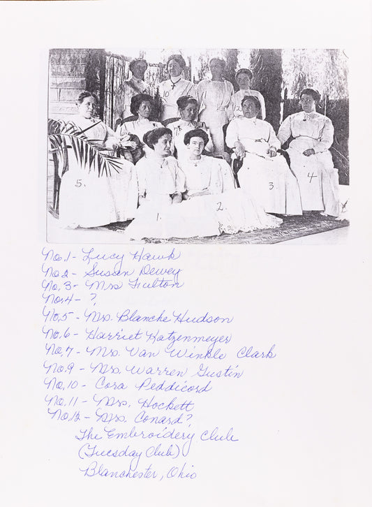 The Blanchester Embroidery Club was formed in 1896. It was a social club for women to discuss a wide variety of topics including literature, fashion, art, music and history. Although clubs like this initially started as literary clubs they eventually became a source of reform for a wide variety of social issues driven by the female member's sense of moral duty to transform public policy.
