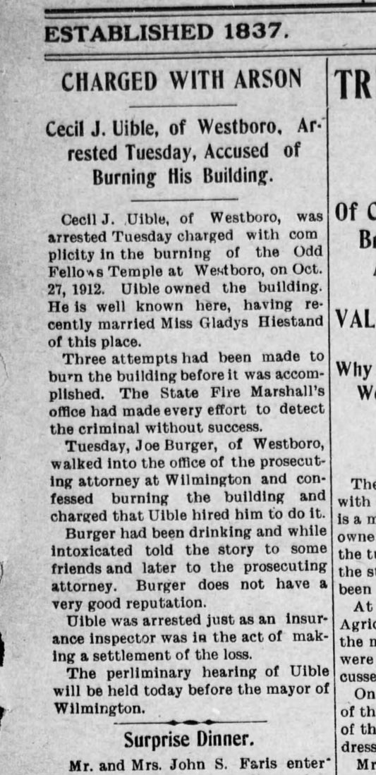 It was originally the voting place for the township, and its growth did not begin until the railroad was run through the county. The Westboro woolen mills were built in the year 1868 by S. J. Spees, Tunmous & Adams, at a cost of about seven thousand dollars. The building was ninety feet long by thirty feet wide. It covers a commodious cellar, thirty by sixty feet, under that portion of the building which was originally constructed for a depot.