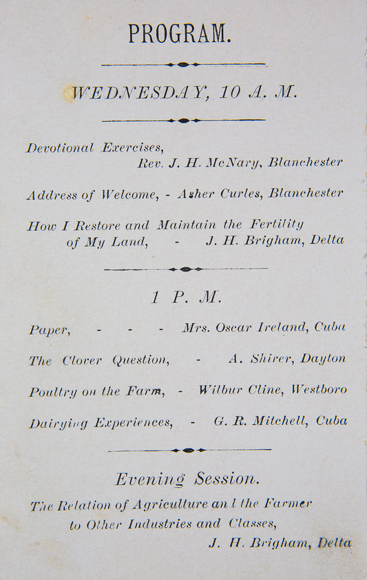 In April, 1874, the establishment was purchased of S. J. Spees by S. Wickersham & Son, who operated the same until about fifteen years ago. It is now used as a wareroom by W. A. Hudson. While the mills were in operation they did both merchant and custom work, and their products were shipped to the following towns and supplied their respective neighborhoods with flannel, jeans and blankets: St. Martins, Fayetteville, Cynthiana, Newtonville, Edenton, Goshen, Blanchester, Wilmington, Cuba, Clarksville, Martinsville, New Vienna, Washington Court House and Lynchburg."